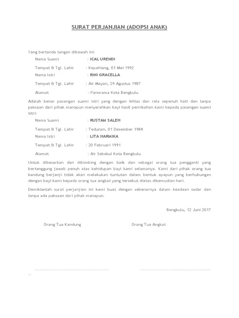 Contoh surat perjanjian adopsi serah terima anak kandung baru lahir surat perjanjian adopsi anak baru lahir. Namun ada baiknya anda melihat contoh surat perjanjian hak adopsi anak yang tepat.